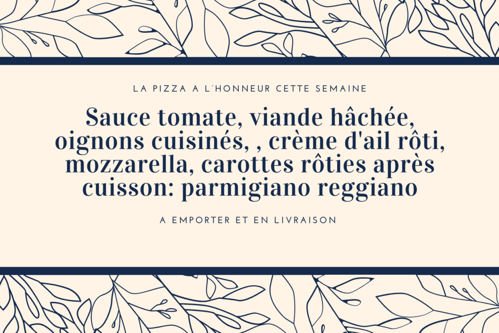 Sauce tomate, viande hâchée 100% boeuf, mozzarella, oignons cuisinés après cuisson: parmigiano reggiano
