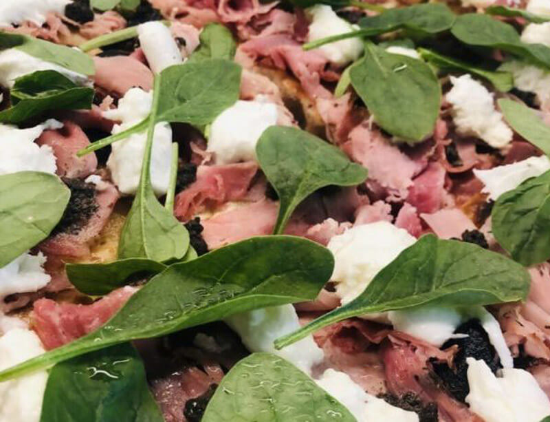Crème fraîche, jambon blanc , crème de champignons et truffes noires, après cuisson : Mozzarella Di Bufala, pousses d’épinards et huile de truffe.