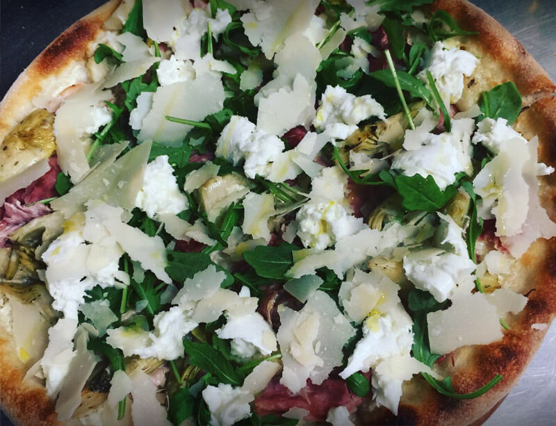 Crème fraîche, jambon blanc , coeurs d’artichauts à la romaine, après cuisson : roquette, Mozzarella Di Bufala, copeaux de parmigiano reggiano et filet d’huile d’olive.